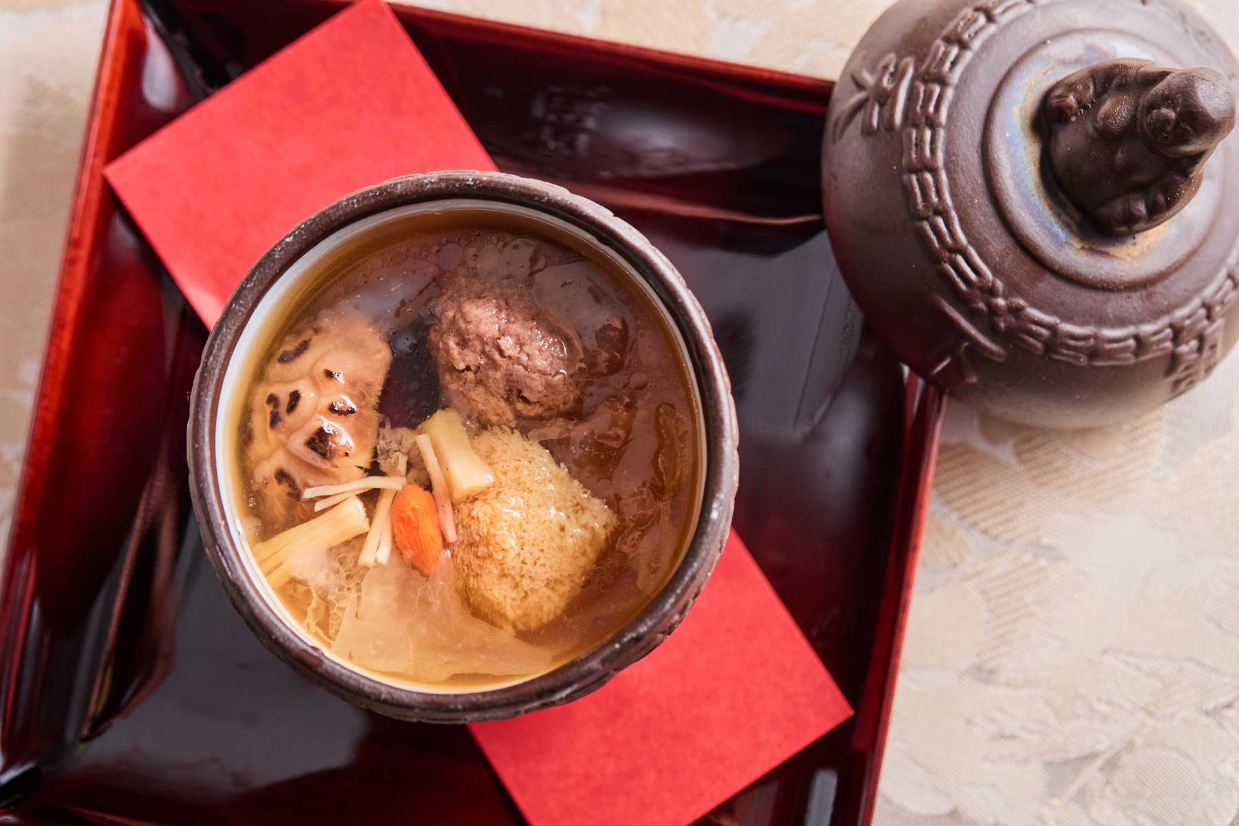鮮やかな広東王道の前菜や壺蒸しスープ、2種の実をブレンドしたプレミアム杏仁豆腐など花閒拘りの神髄をお届け。