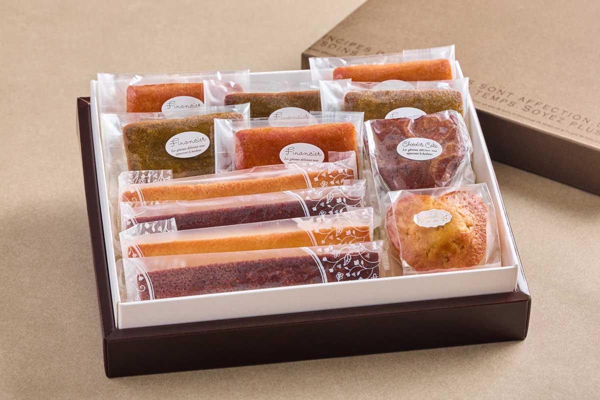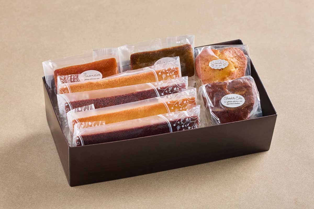フィナンシェプレーン(3個) フィナンシェ抹茶(3個) スティックケーキプレーン(2本) スティックケーキココア(2本) マロンケーキ(1個) ショコラケーキ(1個) 料金 3,800円 ※5,000円以上の詰合せはご要望に応じて承ります。