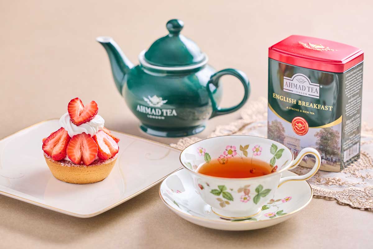 艶やかな苺をふんだんに飾り、紅茶の豊かな香りが口いっぱいに広がるタルト おすすめ紅茶のペアリング "AHMAD TEA"イングリッシュブレックファースト
